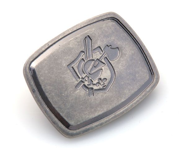 The KAC Loop and Hook Buckle. Equipped with a swinging loop which the belt attaches and a hook on the other side of the buckle which attaches to the hole on the belt. Total buckle size is 2.5 length and 2 height. It has a standard antique nickel finish with the Knight’s Crest centered and debossed.