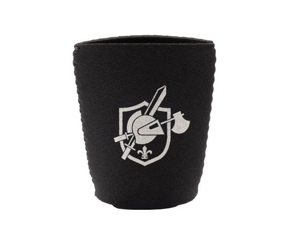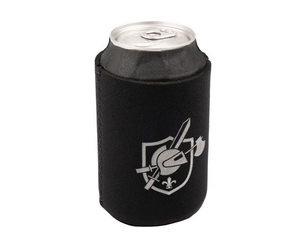 Soft, lightweight neoprene can koozie comes in black with the crest and text logo on both sides in a cool gray screen print.