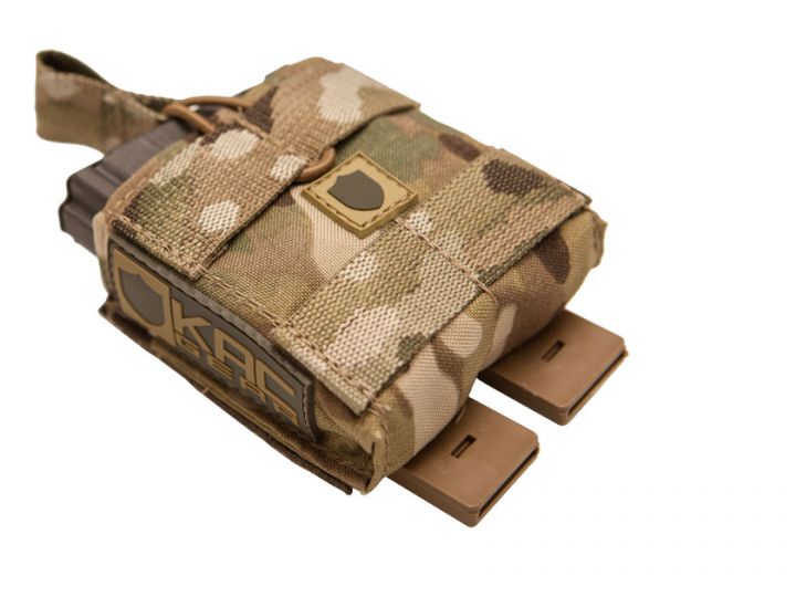 KAC Single 7.62 Mag Pouch will securely hold one ten round 7.62 (.308) magazine. Features an open top design with an adjustable bungee retention strap that allows for silent removal of your magazine and modular webbing on the front and back to allow for stacking other pouches. Attaches to any MOLLE/PALS style webbing with two short MALICE CLIPS (included). Available in Coyote, Gray and MultiCam.