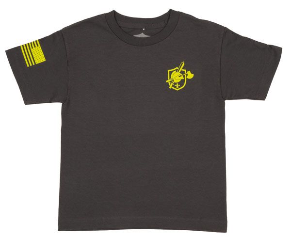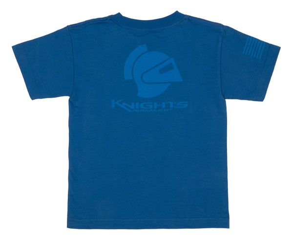 Features Knight’s helmet and logo on the back in bright yellow or blue. The front sports the Knight’s crest in matching bold yellow or blue colors. The sleeve has the American Flag. Shirts come in Charcoal or Blue. Available in Toddler sizes 2T, 4T, and 6T.